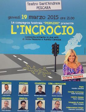 PESCARA – Dopo il grandissimo successo riscontrato nelle prime due tappe del tour (Orsogna e Chieti), l’associazione “Rete Sicurezza Solidale” presenta giovedì 19 marzo con inizio alle 21, presso il Teatro Sant’Andrea di Pescara, la commedia in lingua italiana “L’Incrocio”, regia di Aurelio Caressa, con la compagnia teatrale Iperplessi con la partecipazione straordinaria di Viviana Bazzani. Il tour della compagnia parte dall’Abruzzo per poi girare prossimamente i teatri più importanti d’Italia.