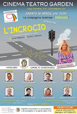 GUARDIAGRELE (CH) – Dopo il grandissimo successo riscontrato nelle prime tappe del tour (Orsogna, Chieti e Pescara), andrà in scena sabato 18 aprile al Cinema Teatro Garden di Guardiagrele la commedia brillante italiana “L’Incrocio” (regia di Aurelio Caressa, con la compagnia teatrale Iperplessi con la partecipazione straordinaria di Viviana Bazzani) presentata, per l’occasione, dall’Associazione Progetto Noemi onlus e l’Associazione Rete Sicurezza Solidale con il Patrocinio del Comune di Guardiagrele. Il tour della compagnia toccherà il 25 Aprile il Teatro Fenaroli di Lanciano prima di due date a maggio a Roma, per poi girare in futuro i teatri più importanti d’Italia.