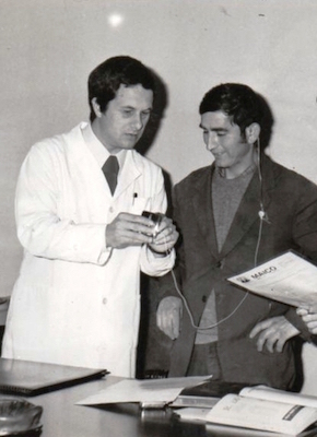 In foto, Nino Menzietti in un’immagine storica di fine anni ’60, mentre consegna un apparecchio acustico a un cliente.