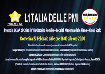 CHIETI – Si terrà oggi,22 febbraio 2015, dalle 16 alle 20 presso la Camera di Commercio Industria e Artigianato di Via Ottorino Pomilio in Località Madonna Delle Piane Chieti Scalo, un incontro pubblico per parlare delle piccole e medie Imprese abruzzesi. L’Italia delle PMI, questo il nome dell’incontro, è organizzato dal Movimento Cinque Stelle Abruzzo, e si svolgerà come una tavola rotonda dove interverranno esperti del settore. Parteciperanno Carla Ruocco M5S, Vice presidente Finanza e Giorgio Sorial M5S Vice presidente Bilancio della Camera dei Deputati; Daniele Del Grosso M5S, Commissione Affari esteri e comunitari; parteciperanno all’incontro anche i Consiglieri Regionale del Movimento Cinque Stelle Abruzzo, Daniele Giangiulli, Segretario Regionale Confartigianato Abruzzo, Pietro Rosica, Presidente Comitato Piccola Industria Confindustria Abruzzo, Graziano Di Costanzo, Direttore Regionale CNA Abruzzo, Gennaro Tornincasa, Imprenditore e Modesto Lolli Imprenditore.