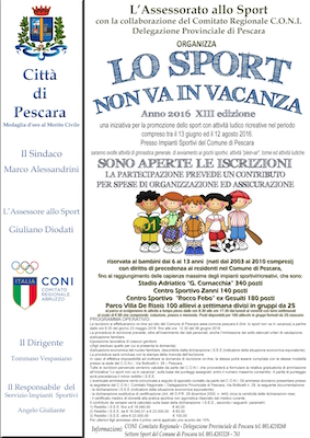 PESCARA – Presentata ieri l’edizione 2016 della manifestazione Lo Sport non va in vacanza, villaggio multidisciplinare per accogliere i ragazzi promosso dall’Amministrazione comunale di Pescara in sinergia con il CONI .