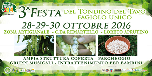 LORETO APRUTINO (PE) – La terza edizione della “Festa del Tondino del Tavo. Fagiolo Unico” torna con nuove date a Loreto Aprutino, presso la Zona Industriale ReMartello, dal 28 al 30 ottobre 2016.