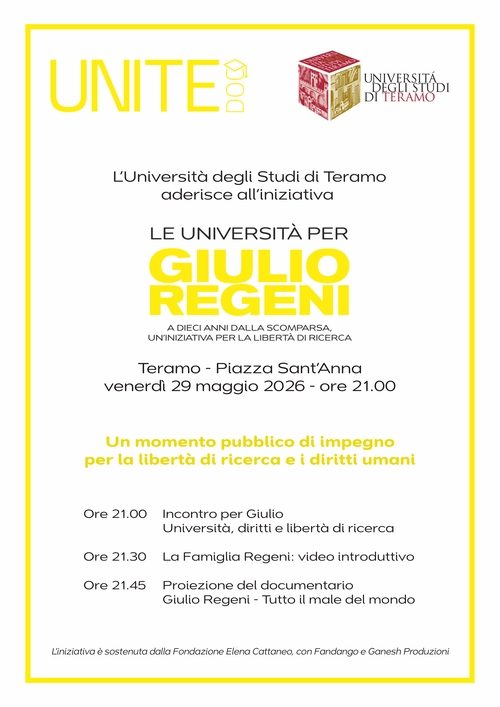 TERAMO – L’Università degli Studi di Teramo aderisce all’iniziativa nazionale “Le Università per Giulio Regeni”, promossa dalla Senatrice a vita Elena Cattaneo a dieci anni dalla scomparsa del giovane ricercatore italiano in Egitto. Nell’ambito del progetto, venerdì 29 maggio alle ore 21.00, in piazza Sant’Anna, si terrà una proiezione speciale del documentario “Giulio Regeni – Tutto il male del mondo”, prodotto da Fandango e Ganesh Produzioni, seguita da un dibattito dedicato ai temi della libertà di studio e di ricerca.