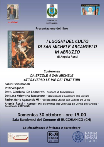 BUCCHIANICO (CH) – Domenica 30 ottobre alle 19.00 nella Sala dei Banderesi di Bucchianico si terrà la presentazione del volume “I Luoghi di San Michele Arcangelo in Abruzzo”. La pubblicazione si sofferma sul culto di San Michele legato alle vie della transumanza tra l’Abruzzo e il Tavoliere delle Puglie, analizzando chiese, eremi, grotte e iconografie dell’arcangelo Michele presenti nella nostra regione. L’evento è organizzato con il patrocinio dell’Amministrazione Comunale, con il Comitato Le donne dell’Angelo e l’Associazione culturale ArteMind.