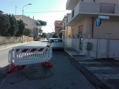 “Da circa 40 giorni alcune transenne del Comune di Montesilvano occupano metà carreggiata di via Chieti, all’angolo di via Torino, a protezione da una rottura della sede stradale.