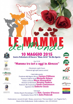 PESCARA – Domenica 10 maggio 2015 alle ore 15.30 presso il Centro Polivalente “Mons. Britti” Via Rio Sparto a Pescara si terrà l’incontro dal titolo Mamma tra ieri e oggi in Abruzzo. Lo stesso vedrà la partecipazione del Presidente della Regione Abruzzo, Luciano D’Alfonso, l’Assessore Politiche Sociali, Marinella Sclocco, il Sindaco di Pescara, Marco Alessandrini, l’Assessore al Volontariato, Veronica Teodoro, l’Assessore alla Cooperazione, Sandra Santavenere e il Segretario CISL, Umberto Coccia. Interverranno: Direttore Reparto Neonatologia e T.V.V., Dott. Carmine D’Incecco, Coordinatrice Donne FNP-PE, Anita Pederzoli. L’appuntamento è anche quest’anno organizzato dall’ANOLF (Associazione Nazionale Oltre le Frontiere), la CISL (FNP – ANTEAS – INAS – CAAF), la CEA (Comunità Eritrea Abruzzo) e l’AICNE (Associazione Interculturale Nessuno Escluso).