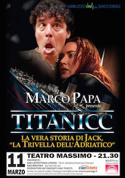 PESCARA – Divertimento e solidarietà mercoledì prossimo, 11 marzo alle ore 21.30 presso il Cinema Massimo di Pescara. Si torna in teatro con lo spettacolo di Marco Papa e Matteo Laudadio e a seguire “Titanicc – la vera storia di Jack, la trivella dell’Adriatico”. Il ricavato della serata sarà devoluto all’associazione Abruzzo In Soccorso per l’acquisto di mezzi e materiale. Le preventite si possono trovare su Ciaotickets – Troyonstage.it e rivendite abituali.