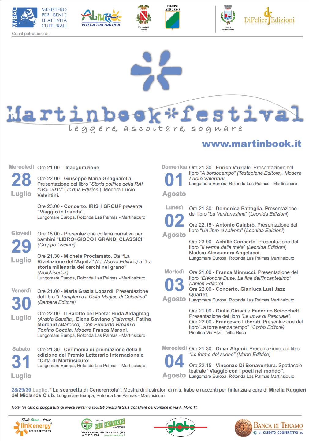 La manifestazione si concluderà domenica 17 luglio con l’assegnazione del Premio Letterario Internazionale Città di Martinsicuro, giunto alla terza edizione. L’evento ha il patrocinio del Ministero per i Beni e le Attività Culturali, della Regione Abruzzo e della Provincia di Teramo.