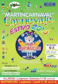 MARTINSICURO (TE) – Si svolgerà domenica 11 e lunedì 12 agosto 2013 il 13° Carnevale Estivo Città di Martinsicuro,rispettivamente a Villa Rosa e Martinsicuro. Due serate dedicate al divertimento in compagnia dei festosi carri allegorici che sfileranno sul lungomare vibratiano portando una ventata di divertimento in questa estate duemilatredici. Le realizzazioni, i costumi e le scenografie sono state curate dai comitati di quartiere – Comitato S. Rita (Presidente Luciano Farci), Comitato Anfiteatro (Presidente Michele Di Nicoli), Comitato Nuova Rosa (Presidente Cristina Capece), Comitato Campo Casone (Presidente Guerino Ritrovati), Comitato Sacro Cuore (Presidente Ermanno Iannetti), Comitato S. Pietro (Presidente Marino Foglia) – che anche quest’anno hanno dato un prezioso contributo alla manifestazione.