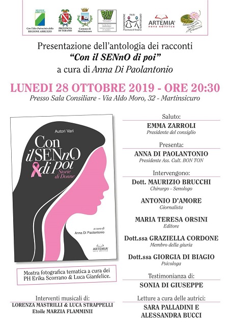 Il mese di ottobre è il mese della prevenzione del tumore al seno, per questo la Commissione Pari Opportunità di Martinsicuro, in collaborazione con l’Associazione “Bon Ton”, ha deciso di organizzare questa iniziativa socio-letteraria che ha l’obiettivo di sensibilizzare e informare sull’importanza della prevenzione, anche attraverso la condivisione empatica ed emotiva delle esperienze e dei vissuti personali di alcune donne che hanno lottato contro il tumore al seno, e che raccontano in modi differenti la loro personale battaglia” sottolinea la Presidente della Cpo truentina, Giorgia Di Biagio.