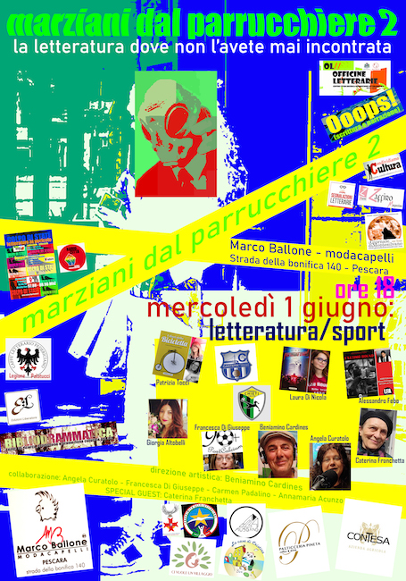 Gli scrittori e le scrittrici ospiti del primo appuntamento marziano, tutto dedicato allo Sport e ai valori dello sport in rapporto con la Letteratura, saranno: Patrizia Tocci (giornalista, scrittrice) con “I diari della bicicletta” (Tabula Fati), Alessandro Febo (attore, scrittore) con “L’ultimo round” (LFA Publisher), Giorgia Altobelli (sociologa dello sport), Laura Di Nicola (blogger, scrittrice) “Formula Uno!” (Solfanelli), Francesca Di Giuseppe (blogger, www.postcalcium.it), Chieti Calcio Femminile, Cantera Adriatica Pescara. Special guest di Marziani.2 la poetessa performer Caterina Franchetta (“La parlatura parlate” autoprodotto, Pescara). Moderatori dell’evento Angela Curatolo (direttrice www.zaffiromagazine.com) e Beniamino Cardines (giornalista, scrittore).