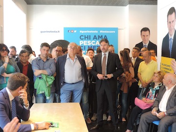 “Noi abbiamo una squadra straordinaria di candidati, più di 150 – ha sottolineato il sindaco Albore Mascia – che in 7 giorni faranno una campagna elettorale formidabile, perché il senso di appartenenza prevale in tutti quelli che hanno dato loro stessi per Forza Italia, per Guerino e per tutte le liste. Oggi abbiamo un esercito unico di persone che credono nel senso di appartenenza al centro-destra, e il risultato positivo del ballottaggio è alla nostra portata. Al primo turno non abbiamo dato un segnale di coesione, oggi stiamo restituendo slancio alla coalizione. E domattina, anticipo, che avremo un altro apparentamento con un altro candidato che ha corso solo al primo turno, e il risultato del primo turno è la testimonianza di chi non ha gradito la parziale divisione, o di chi non ha votato. Da questo momento non ci sono più alibi. Voglio inoltre sottolineare che ieri sera abbiamo avuto un’ora e mezza di confronto-incontro tra gli esponenti di partito e non c’è stata una sola sottolineatura sulla squadra di governo che avremo all’indomani dell’8 giugno, dunque non abbiamo parlato di vicesindaco o assessori, abbiamo parlato solo del rilancio programmatico, dei temi da affrontare nei dibattiti televisivi ai quali si sottrae Alessandrini, lui che non gradisce il ‘teatrino’ della politica, di cui è però un comprimario per il ruolo o il non-ruolo che gli è stato affidato dal Pd. Ma oggi Alessandrini si è candidato a essere un attore principale della scena politica, un candidato che però rifiuta i confronti diretti che invece sono una straordinaria occasione per consentire ai cittadini di misurare la competenza. Io voglio continuare a guidare Pescara che è un grande translatantico e per fortuna di Schettino ce n’è uno solo”.