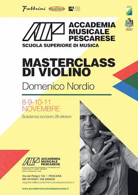 PESCARA – Da domenica 8 novembre a mercoledì 11 novembre si terrà una Masterclass di Violino con Domenico Nordio presso l’Accademia Musicale Pescarese.