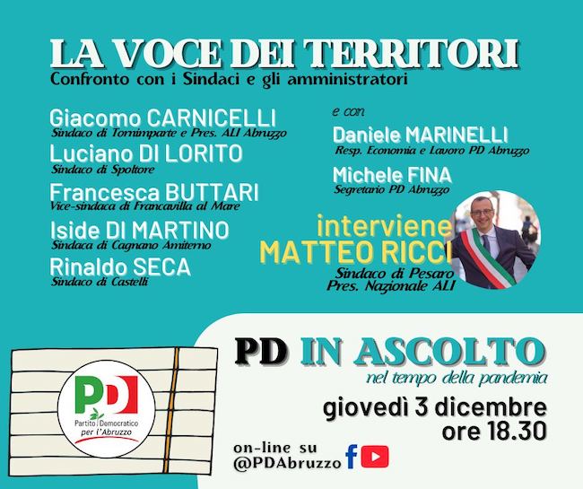 REGIONE – Si terrà giovedì 3 dicembre, a partire dalle 18.30, in diretta Facebook sulla pagina del Partito Democratico abruzzese, l’iniziativa “La voce dei territori”, un confronto con i sindaci e gli amministratori. Interverranno Matteo Ricci, sindaco di Pesaro e presidente di ALI (Autonomie locali italiane), Giacomo Carnicelli (sindaco di Tornimparte e presidente di ALI Abruzzo), Luciano Di Lorito (sindaco di Spoltore), Francesca Buttari (vicesindaca di Francavilla al Mare), Iside Di Martino (sindaca di Cagnano Amiterno), Rinaldo Seca (sindaco di Castelli), oltre a Michele Fina e Daniele Marinelli, rispettivamente segretario e responsabile economia e lavoro del PD Abruzzo.