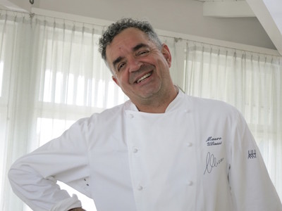 Chef eclettico e metodico, passa con grande semplicità da complesse architetture che esaltano il mare a classiche preparazioni d’ispirazione francese. Ecco cosa presenterà venerdì a Les Paillotes: Gambero rosso, gelatina di scalogno e pinoli; Esquisada di merluzzo; Zuppa di fagioli cannellini, cozze, astice e pasta; Baccalà, sugo di baccalà alla griglia e granaglie; Granita di fragola con meringhe al limone e cardamomo. Menu al costo di 110 euro, vini inclusi.