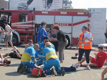 olta un Campus formativo per la simulazione di diversi scenari di emergenza sanitaria, iniziativa organizzata dalla Misericordia che è stata presente con ben 120 operatori, e che ha coinvolto vigili del fuoco, uomini della Protezione civile e altre organizzazioni di primo soccorso. All’interno del Campus sono state prefigurate varie situazioni che sono rimaste segrete sino all’ultimo perché hanno rappresentato anche un test di valutazione dei volontari per verificare il loro effettivo grado di preparazione. Il coordinamento degli interventi sanitari è stato affidato al 118 con i Vigili del fuoco. Il Campus è stato allestito dalle 13 alle 20: alle 16.30 in punto è scattata la maxi-operazione con la messa in scena dell’incidente tra una Fiat Punto e un autobus del trasporto pubblico pieno zeppo di passeggeri. Quando i soccorritori sono arrivati sul posto hanno dovuto scegliere le priorità, aiutando coloro che erano usciti da soli dal bus ed erano riversi a terra e coloro che invece erano rimasti intrappolati a bordo del bus in fiamme. Altre unità hanno invece prestato soccorso a coloro che erano rimasti bloccati nell’auto, tra le lamiere contorte, con l’intervento dei Vigili del Fuoco. E poi il ‘caso’ di una donna in stato interessante che è stata soccorsa con l’ausilio dell’elicottero. A valutare l’operato dei 120 volontari della Misericordia sono state le unità della Croce Rossa e del 118. La Misericordia ha messo in piedi una macchina organizzativa estremamente complessa che però ha dimostrato come ormai anche l’istituto del volontariato non si affida più all’improvvisazione, ma cerca sempre più figure professionali preparate. Complessivamente sono state oltre 200 le persone che abbiamo visto in azione.