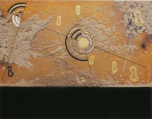 Per quanto riguarda poi la seconda fase della ricerca pittorica dell’artista, va detto che essa è stata influenzata dalla poetica infonnale e dalla filosofia zen, intesa appunto, come recita il titolo dell’esposizione quale introspezione e desiderio di ascesi. Il modulo grafico sempre ricorrente nelle sue opere, simile ad un ottovolante significa proprio questo percorso di scandaglio interiore.