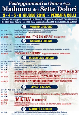 PROGRAMMA COMPLETO – La cantante pugliese chiuderà il programma dei Festeggiamenti in Onore della Madonna dei Sette Dolori partiti ufficialmente nella giornata odierna con le Sante Messa delle 18.30 e delle 20. Alle 21.30 concerto dei “The Big Years” musica anni ’60-’70.