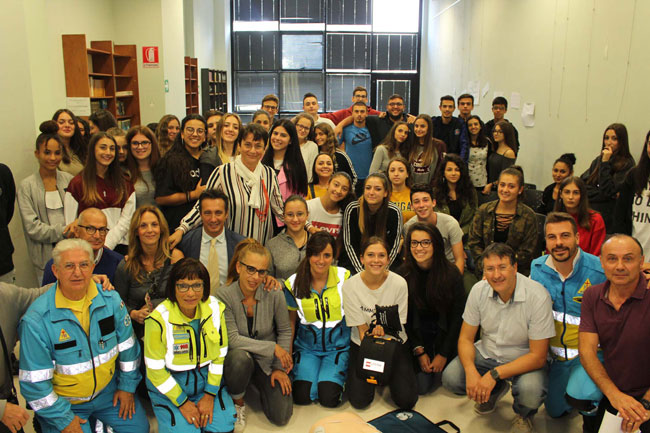Dopo il saluto del Presidente dei Probiviri Cicconetti, la dirigente De Angelis ha ricordato come “il defibrillatore donato al Liceo Spaventa in realtà rappresenta un ausilio a disposizione di tutto il territorio che gravita attorno alla scuola stessa e deve rappresentare un incentivo al volontariato anche per i nostri ragazzi, uno stimolo a sviluppare la sensibilità per i bisogni degli altri”. Subito dopo la consegna ufficiale del defibrillatore i volontari della Misericordia hanno guidato una lezione di rianimazione cardiopolmonare illustrando le modalità di utilizzo di un defibrillatore, fornendo ai ragazzi le prime nozioni teoriche e anche pratiche, chiedendo agli stessi studenti di cimentarsi, personalmente, nel massaggio cardiaco e nell’attivazione di un defibrillatore su un manichino.