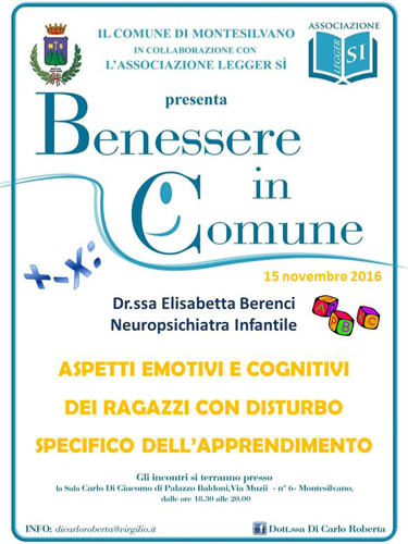 15 NOVEMBRE 2016 – Aspetti emotivi e comportamentali dei ragazzi con DSA – Dott.ssa Elisabetta Berenci, neuropsichiatra infantile,;