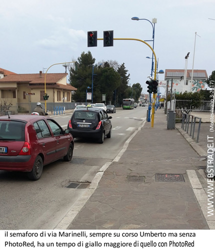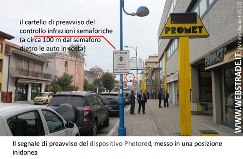 In particolare, la segnaletica di annuncio del PhotoRed in direzione Pescara è a circa 100 m di distanza dal semaforo, troppi anche per il Codice della strada (prescritti in area urbana da 50 a 80 m). In realtà, essendo consentito il parcheggio su strada ed essendo presenti una gran quantità di segnali pubblicitari, quel cartello è quasi inavvertibile dagli automobilisti a quella distanza.