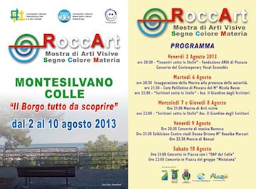 MONTESILVANO (PE) – Oggi,6 agosto 2013 prende il via “RoccArt”, la manifestazione culturale che fino al 10 agosto ,con il suo ricco cartellone , animerà lo splendido borgo di Montesilvano Colle. L’evento fa seguito a “65015”, l’iniziativa organizzata dal 27 al 29 luglio che ha visto la partecipazione di oltre 150 bambini, impegnati nella creazione di vere opere d’arte.