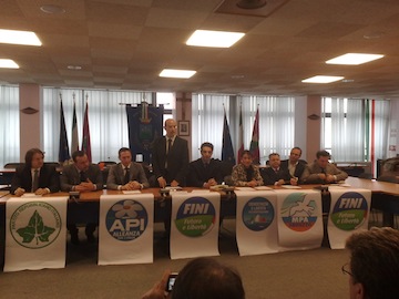 Fanno parte della coalizione a sostegno del candidato: Futuro e libertà, Fli, Movimento per le Autonomie, Mpa, l’Alleanza per l’Italia, Api, Partito Repubblicano Italiano, Pri, e la lista civica Democrazia e libertà.