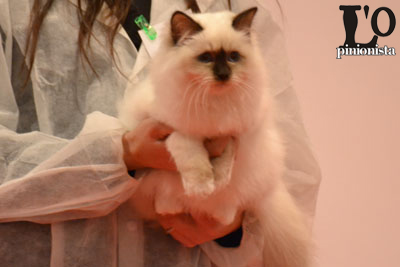 A conclusione di questa seconda giornata un’immancabile esposizione di Sacri Di Birmania, graziosi felini denotati da un pelo semilungo caratterizzato dei peculiari guantini bianchi (punta di rilievo per la valutazione della razza) e la tipica colorazione zaffiro degli occhi, ospiti speciali dell’Expo con ben 46 esemplari esibiti, un numero ragguardevole se si pensa ai 108 esemplari presentati alla prima speciale a Firenze dalla stessa Associazione Italiana Birmani (L’A.I.Bir.) rappresentata dalla responsabile Expo Rossella Mercadante, nonché proprietaria dell’allevamento Zaffiri Blu, che ci illustra le particolarità dei Sacri Di Birmania e la leggenda della nascita della specie che narra dell’uccisione di un monaco, Kittah, presso il popolo degli Khmer nell’antica Birmania, custode di un tempio dedicato ad una dea dagli occhi color zaffiro, protettrice della anime durante la trasmigrazione, e di cento gatti dal pelo bianco. Secondo questa leggenda uno dei gatti ospitati dal monaco saltò sul suo corpo esanime e il suo manto mutò colorandosi di oro, gli occhi divennero dello stesso colore di quelli della dea e le zampe si sporcarono di terra, solo quelle anteriori mantennero il candore originario del gatto, denotando così i caratteristici guantini della razza.