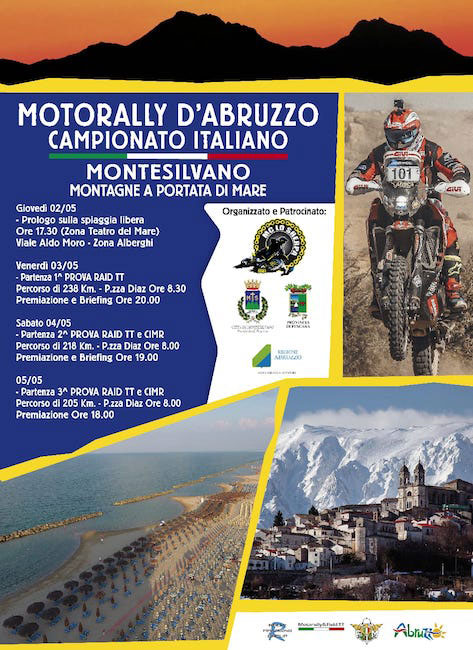 MONTESILVANO – Sarà Montesilvano ad ospitare il “Motorally d’Abruzzo”, organizzato dal Moto Club Lo Sherpa. Si comincia giovedì 2 maggio con il prologo sulla spiaggia libera a partire dalle 17:30 nell’area antistante il Teatro del Mare. La gara vera e propria entra nel pieno venerdì 3 maggio, con la partenza da piazza Diaz della prima prova Raid TT (Tout Terrain) in un percorso di 238 km, dalle 8.30.