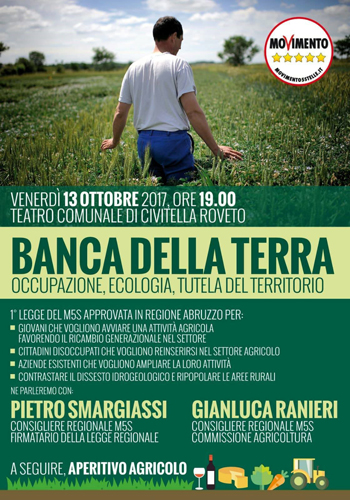 CIVITELLA ROVETO (AQ) – Venerdì 13 ottobre 2017 il gruppo 5 stelle di Civitella Roveto (AQ) terrà un convegno sulla Banca della Terra.