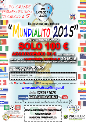 PESCARA – Sono aperte le iscrizioni per la 8a edizione del torneo estivo (2015) “Mundialito Ama il Calcio a 5”, che si svolgerà al Centro Sportivo 2000 (Pescara c/o San Silvestro, colle breccia). Il torneo inizierà il giorno 8 giugno per terminare alla fine di luglio. Il costo dell’iscrizione a squadra è di sole 100 euro, aggiungendo 50 euro è possibile iscrivere la propria squadra anche al campionato invernale 2015/2016. Il numero massimo di squadre partecipanti è 40. I requisiti per la partecipazione sono la serietà e l’educazione. Il torneo “Ama il Calcio a 5” è il più conosciuto evento sportivo open abruzzese, difatti si possono contare all’incirca 7.000 atleti ed oltre 300 squadre che hanno partecipato ad almeno una delle tante edizioni.