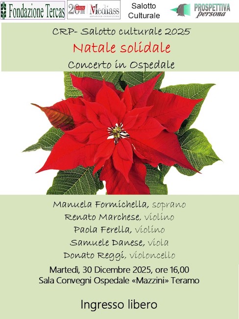 TERAMO – Martedì 30 dicembre 2025, alle ore 16.00, la Sala Convegni dell’Ospedale “Mazzini” di Teramo ospiterà il concerto Natale solidale, uno degli appuntamenti del programma CRP – Natale Solidale 2025. Un momento pensato per portare musica, spiritualità e vicinanza ai degenti e al personale sanitario, offrendo un’occasione di serenità nel periodo natalizio.