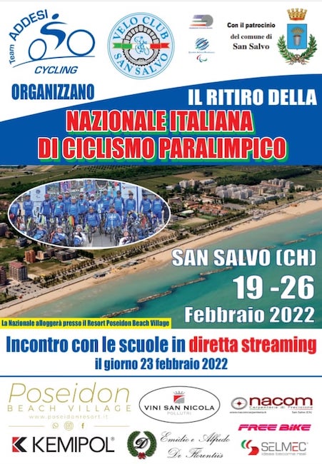 SAN SALVO – A un anno dal decennale della nascita e tra i motori principali dell’attività ciclistica paralimpica in Abruzzo, l’Addesi Cycling continua la propria missione per promuovere lo sport e il tema dell’inclusione senza ostacoli. Dopo aver organizzato con successo i ritiri azzurri nelle località abruzzesi di Pescara, Francavilla al Mare e Pineto, il 2022 è l’anno della new entry San Salvo che ospita un nuovo e inedito ciclo di allenamenti della nazionale guidata dal neo commissario tecnico Rino De Candido. A curare come sempre tutti i dettagli a livello organizzativo l’Addesi Cycling di Pierpaolo Addesi con il patrocinio del Comune di San Salvo e la collaborazione dell’omonimo Velo Club. Dal 19 al 26 febbraio sono attesi una trentina di atleti del giro azzurro accolti presso la confortevole struttura del Poseidon Beach Village Resort.