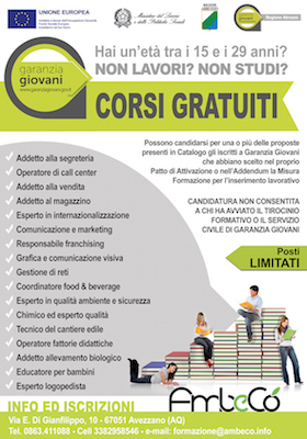 AmbeCò, società esperta attraverso i corsi offre ai giovani l’opportunità di approfondire tematiche in linea con le esigenze delle richieste aziendali. Per accaparrarsi subito un posto in prima fila nel mondo del lavoro, occorre iscriversi, quanto prima, ai corsi offerti da AmbeCò, miranti a creare figure professionali capaci di lavorare, ad esempio, in asili nido, con minori con disabilità, in ambito di istallazione di impianti elettrici e di progettazione. I corsi sono tutti riconosciuti dalla Regione Abruzzo: per far parte del gruppo di lavoro, c’è tempo fino al 14 aprile 2016. I corsi di formazione, inoltre, vanno dalle 100 ore totali di teoria e pratica, sino ad un massimo di 130 ore, affiancate da 200 ore di stage aziendale. Si ricorda, infine, ai ragazzi interessati, che è possibile ancora iscriversi ai corsi, contattando direttamente la cooperativa marsicana AmbeCò all’indirizzo e-mail: formazione@ambeco.info o al numero di telefono: 0863-411088. Per tutti i giovani non ancora iscritti al programma di Garanzia Giovani, inoltre, è possibile ancora adesso effettuare l’iscrizione, tramite il portale web: http://www.garanziagiovani.gov.it. o recandosi presso gli uffici dei centri per l’impiego del proprio territorio. Per qualsiasi informazione relativa all’iscrizione ai corsi o a Garanzia Giovani è possibile rivolgersi alla cooperativa AmbeCò.