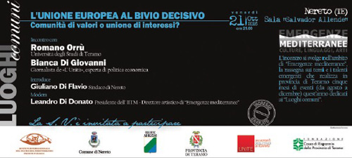 Appuntamento venerdì 21 ottobre, alle ore 21, nella Sala Salvador Allende del Comune di Nereto con “L’Unione Europea al bivio decisivo: comunità di valori o unione di interessi?”.