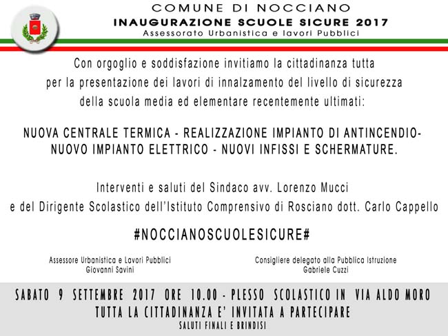 NOCCIANO (PE) – Oggi, sabato 9 settembre 2017,a Nocciano, si terrà l’inaugurazione del completamento dei lavori di innalzamento del livello di sicurezza della scuola Elementare-Media.