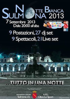 SULMONA (AQ) – Domani, 7 settembre 2013, a partire dalle ore 20.00 prenderà il via la Notte Bianca della Città di Sulmona, appuntamento d’intrattenimento vario e cultura di fine estate molto atteso. Quest’anno cresce sensibilmente l’offerta di eventi concentrati in una notte in ben 9 postazioni, tutte nel centro di Sulmona.