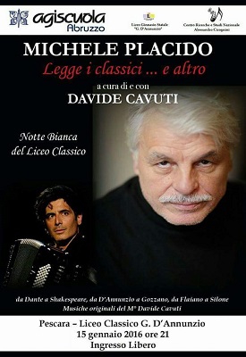 “Lo spettacolo è da non perdere – assicura il compositore Davide Cavuti – L’appuntamento con Michele Placido è una proposta sui classici: da Catone e Catullo, Dante ma anche con una finestra sugli abruzzesi, da Silone a Flaiano. Abbiamo già al nostro attivo come sodalizio uno spettacolo su Fontamara con Michele, messo in scena a Roma proprio dopo il terremoto del 2009 che verrà riproposto in parte e poi non mancherà d’Annunzio, ma anche Flaiano. Un percorso accompagnato dalla mia musica e quelle di Cicognini il quale lavorò con Flaiano in molti film”.