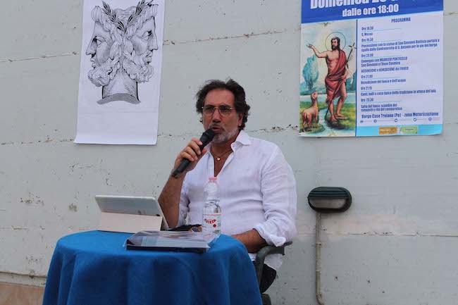 Quindi spazio allo scrittore Maurizio Ponticello che ha offerto un approfondimento sulla figura del San Giovanni e che, con la volontà esplicita di provocare anche la reazione del pubblico, ha posto quesiti e interrogativi sulle origini del Santo, con la festa che cade proprio nel periodo del solstizio d’estate, con una miriade di simboli mitologici, allegorici e di rimandi che affondano le radici nella fede e nella religione, che hanno suscitato l’attenzione e la curiosità dei presenti. A Ponticello l’Associazione Fontevecchia ha donato una targa ricordo consegnata dall’assessore Rullo. Subito dopo spazio alla musica con il gruppo ‘Prendila Così’, cover band di Lucio Battisti e a mezzanotte in punto si sono ripetuti i riti del San Giovanni, ovvero coppie di amici che hanno attraversato a piedi nudi il lago, simbolo del Giordano, con in mano il tradizionale ramajetto e, subito dopo, il fuoco di San Giovanni a sugellare un rapporto di amicizia e di reciproco aiuto che spesso supera quella tra fratelli.