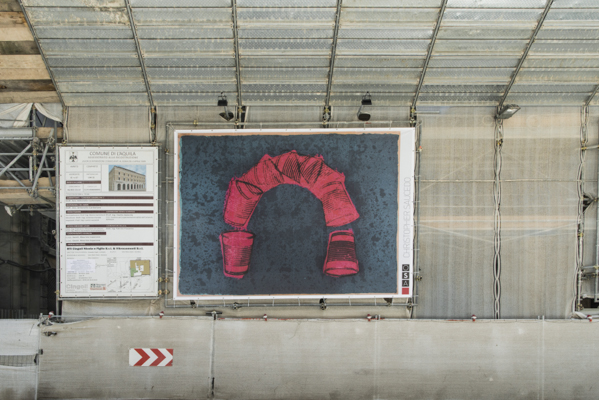 Sul cantiere della sede Carispaq, da qualche settimana gli operai dell’impresa Cingoli hanno installato le opere di Christopher Saucedo, Laura Manfredi, Crys Yin e Anna Capolupo.