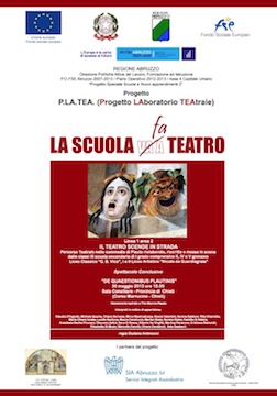CHIETI – Oggi,alle ore 18.00 presso la Sala Consiliare della Provincia di Chieti, in Corso Marrucino, il primo appuntamento con i frutti del progetto PLATEA – Progetto Laboratorio TEAtrale, iniziativa finalizzata a portare il teatro nelle scuole, finanziata dal PO.FSE. Abruzzo 2007 – 2013 – Piano Operativo 2012-2013 – Asse 4 Capitale Umano – “Progetto Speciale Scuole e Nuovi apprendimenti 2”.