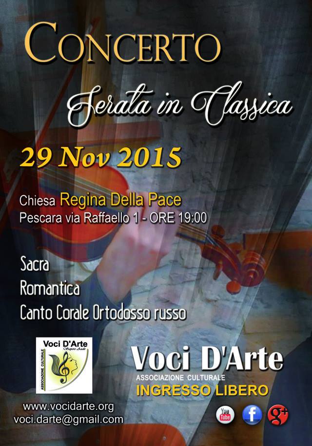 PESCARA – E’ in programma oggi, domenica 29 novembre 2015, alle ore 19.00, nella Chiesa Regina della Pace, via Raffaello 1 Pescara, un concerto dell’Associazione Culturale Voci D’Arte. Il concerto dal titolo “Serata in Classica” prevede l’esecuzione di brani di musica Sacra, Romantica e di Canto Corale Ortodosso Russo.
