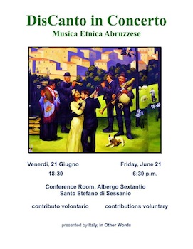 SANTO STEFANO DI SESSANIO (AQ) – Oggi, venerdì 21 giugno, dalle ore 18.30 i DisCanto terranno un concerto presso la Conference Room dell’ Albergo Diffuso Sextantio a Santo Stefano di Sessanio.