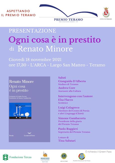 TERAMO – Protagonista del terzo appuntamento della rassegna letteraria “Aspettando il Premio Teramo” sarà Renato Minore, che presenterà il suo nuovo libro di poesie, Ogni cosa è in prestito, un’autoantologia che racconta tutta la sua storia di poeta. L’evento si terrà all’Arca di Teramo, in Largo San Matteo, giovedì 18 novembre 2021, alle ore 17,30.