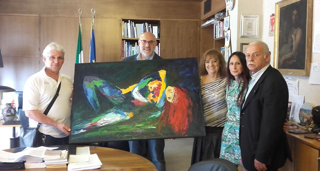 La pittrice ha consegnato il quadro, un olio su tela dal forte impatto cromatico, al Sindaco Umberto Di Primio, alla presenza di Annarita Melaragna, curatrice della mostra.