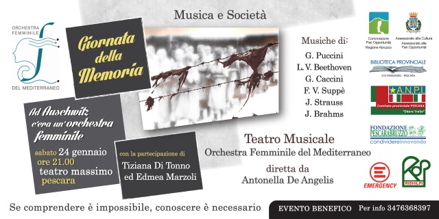 ORTONA (CH) – Si svolgerà mercoledì 28 gennaio, alle ore 21.00 presso il Teatro Francesco Paolo Tosti di Ortona, la pièce “Ad Auschwitz c’era un’orchestra femminile”, con la partecipazione dell’Orchestra Femminile del Mediterraneo, diretta da Antonella De Angelis e delle attrici Tiziana Di Tonno e Edmea Marzoli. Lo spettacolo, organizzato dall’Orchestra Femminile del Mediterraneo e dalla Fondazione Dean Martin con il patrocinio del Comune di Ortona e della Commissione Pari Opportunità della Regione, è liberamente tratta dal libro “Ad Auschwitz c’era un’orchestra” della pianista cantante Fania Fénelon deportata nel campo di concentramento di Auschwitz, luogo in cui le SS vollero costituire un’orchestra femminile con le prigioniere. Verranno eseguiti brani amati dai gerarchi nazisti: Puccini, Mascagni, Beethoven, Brahms, Strauss, Caccini e Sibelius, che si intersecheranno con la narrazione e la drammatizzazione delle protagoniste, mettendo in luce gli stati psicologici delle deportate musiciste costrette a suonare fino a 18 ore al giorno davanti ad un pubblico di prigionieri e carnefici.