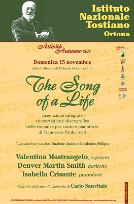 L’Istituto nel frattempo ha programmato le sue attività autunnali di cui si è già data notizia su Facebook. Il prossimo appuntamento previsto per domenica 15 novembre, alle ore 17.00 nella Sala di Musica di Palazzo Corvo proporrà un concerto completamente dedicato a Tosti che vedrà impegnati il soprano Valentina Mastrangelo, il baritono Denver Martin Smith e la pianista Isabella Crisante. Si tratta di uno dei concerti del progetto di edizione integrale concertistica e discografica avviato sin dal 2014 che prevede appunto l’esecuzione completa delle romanze tostiane in ordine cronologico secondo il catalogo delle opere redatto da Francesco Sanvitale, storico direttore dell’ente che, purtroppo, è deceduto proprio quest’anno.