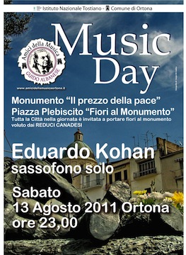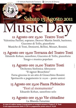 ORTONA (CH) – Sabato, 13 agosto, a Ortona si svolgerà il “Music Day” 2011, la giornata della musica, evento mai interrotto dal 1983 e organizzato dalla prestigiosa istituzione aquilana, gli Amici della Musica e dall’Istituto Tostiano con il patrocinio del Comune di Ortona.