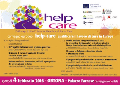 Dopo i saluti delle istituzioni regionali, provinciali e comunali i lavori saranno aperti dalla coordinatrice del progetto, Carolyn Downs, docente dell’Università di Lancaster (Regno Unito) a cui seguirà l’intervento della responsabile dei Servizi Sociali, Paola Paolini, che parlerà del “ Sistema di cura nel territorio ortonese. Servizi e buone prassi”. La responsabile del centro di ricerca e promozione interculturale del Comune di Ortona, Dasantila Hoxha, relazionerà sul tema “ Badare non basta. Dimensioni, criticità e prospettive del lavoro di cura in Italia”. “Perché abbiamo bisogno del lavoro di cura? La prospettiva degli educatori su tendenze attuali e bisogni futuri nel settore socio-sanitario in Inghilterra” è invece il tema che presenterà Paul Ineson del Lancaster e Morecombe College (Regno Unito), mentre Valentina Georgieva, del Centro Studi e Formazione Znanie( Bulgaria) parlerà di “Helpcare in Bulgaria, situazione attuale e prospettive future”. Relazionerà sul tema “ Il progetto Helpacare in Polonia, esperienze e osservazioni” Ilona Swiatek-Barylska docente dell’Università di Lodz (Polonia). Conclude gli interventi George Pavlidis del South Est European Research Center ( Grecia) con “ Il progetto Helpcare in Grecia”. Coordina i lavori il Dirigente dei Servizi Sociali del Comune di Ortona, Domenico Galanti.