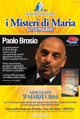 ORTONA (CH) – Entra nel vivo il calendario dell’anno giubilare della “Chiesa della Madonna di Fatima” della Stazione di Caldari a Ortona, mercoledì 9 Marzo 2016 ore 18.30 è in programma la presentazione del libro “I misteri di Maria” del famoso giornalista ed esperto “mariano” Paolo Brosio.
